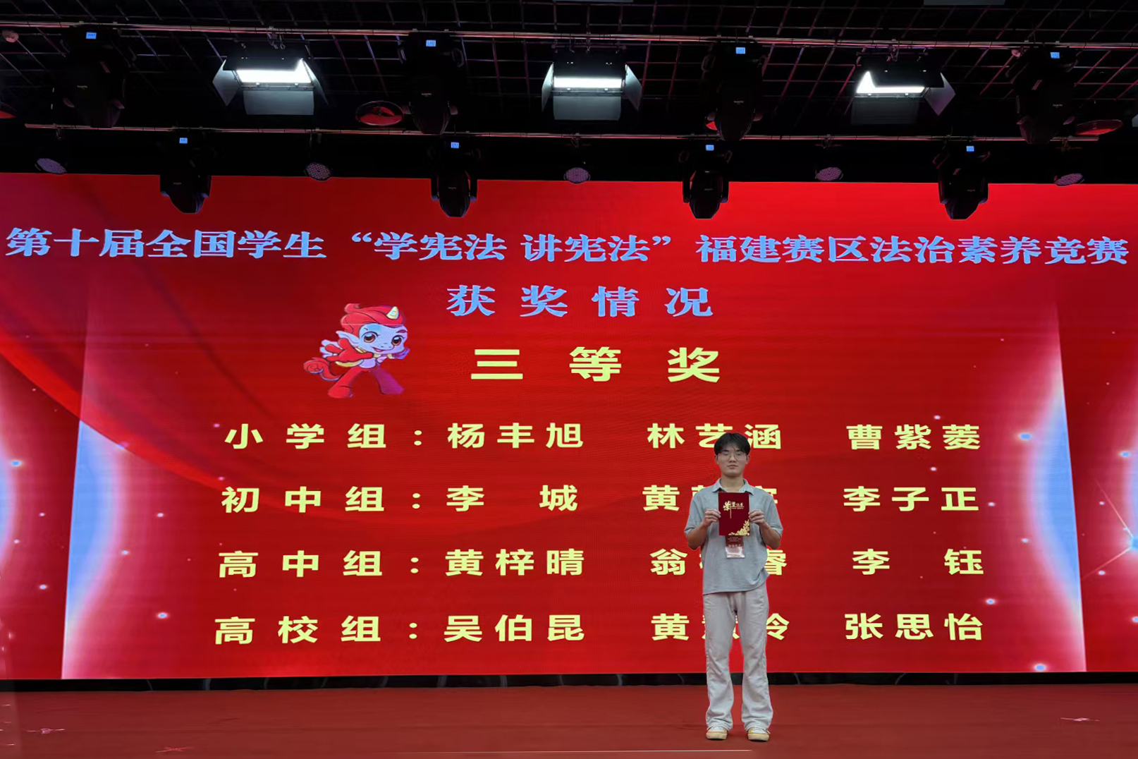 9月27日至28日,由省教育厅、省司法厅主办,福建船政交通职业学院承办的第十届全国学生“学宪法 讲宪法”福建赛区总决赛在福州举行。经过激烈角逐,我校陈守仁商学院2023级知识产权专业吴伯昆同学(指导老师:潘保安)荣获高校组法治素养竞赛三等奖。