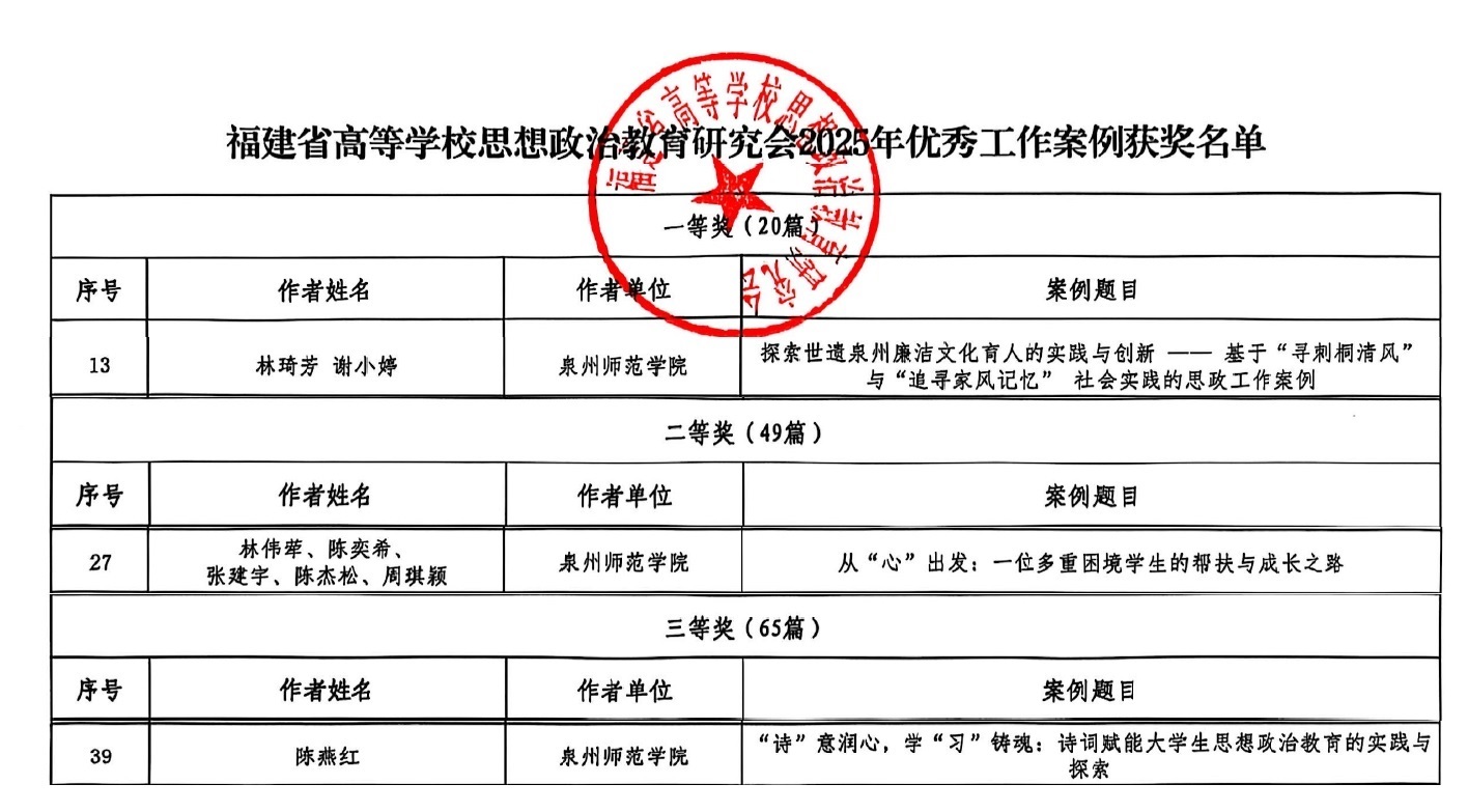 近日,福建省高等学校思想政治教育研究会公布了2025年优秀工作案例获奖名单,我校共有3个案例入选