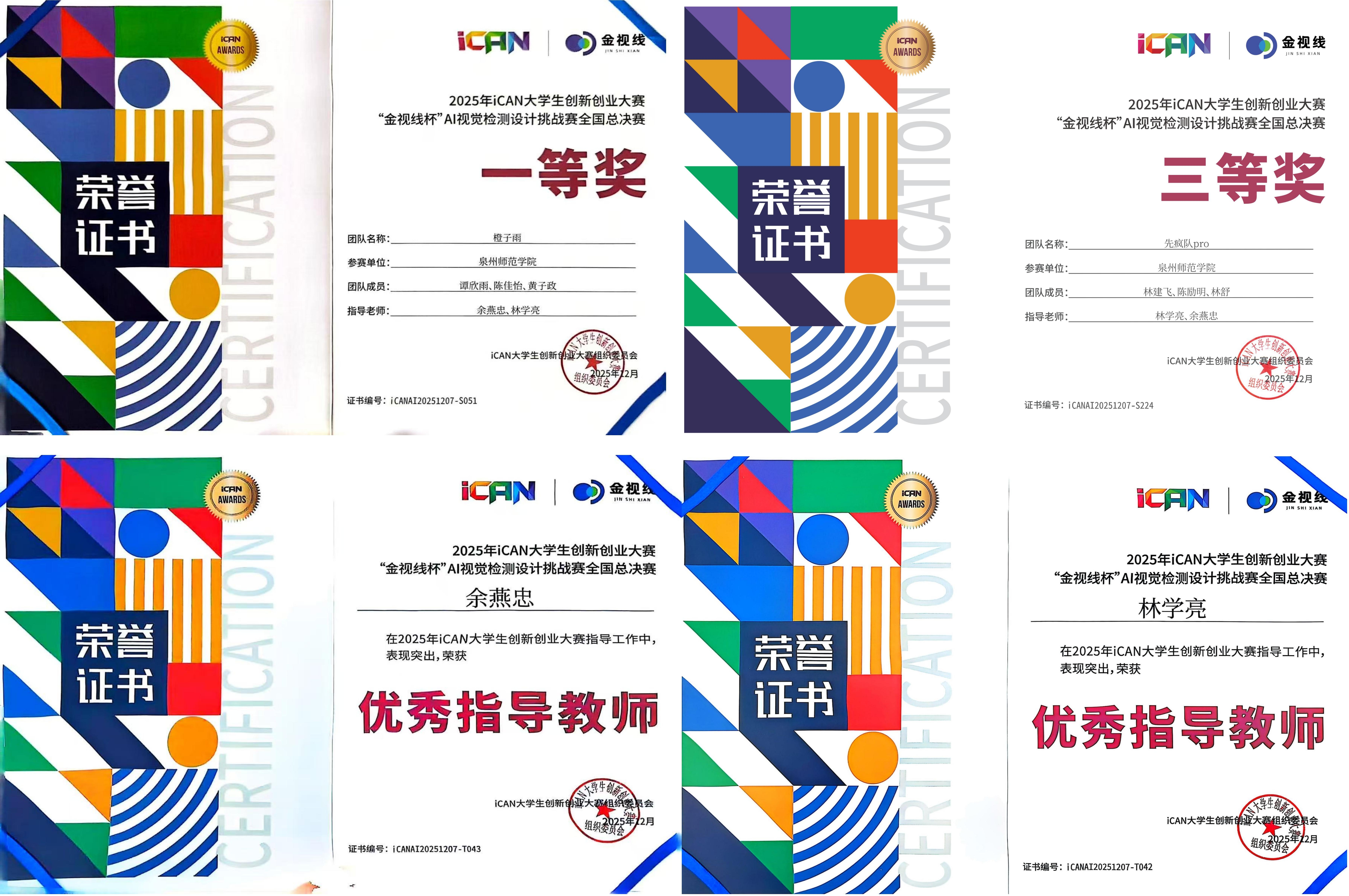 近日,2025年iCAN大学生创新创业大赛“金视线杯”AI视觉检测设计挑战赛全国总决赛在江苏大学圆满落幕。我校光电工程系学子表现亮眼,勇创佳绩。其中,橙子雨队(谭欣雨、陈佳怡、黄子政)获全国一等奖,先疯队pro队(林建飞、陈励明、林舒)获全国三等奖;余燕忠、林学亮获评“优秀指导教师”。