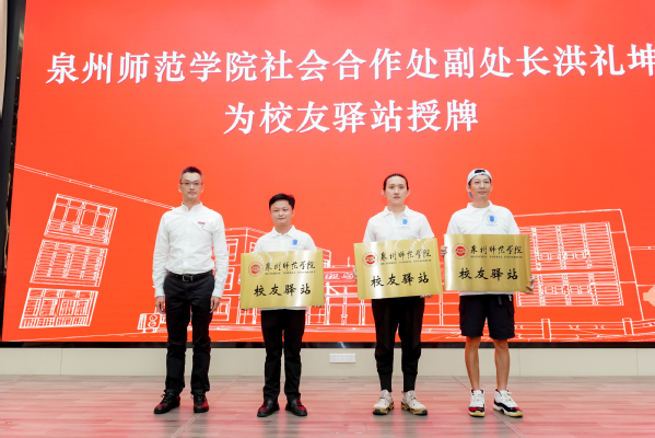 社会合作处副处长洪礼坤为校友驿站负责人授牌。为了给校友们提供联络与服务的平台,学校在学院校友创业的福建省印记闽南文化旅游发展有限公司、恩力时(厦门)体育用品有限公司和泉州艺燥品牌管理有限公司分别设立了厦门、晋江、泉州中心市区三处校友驿站。