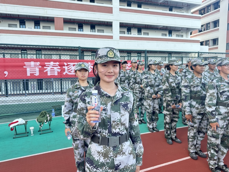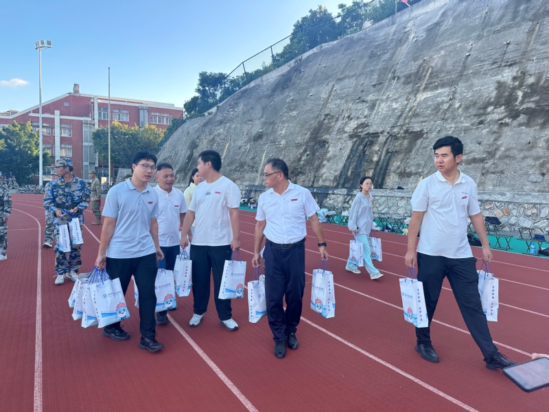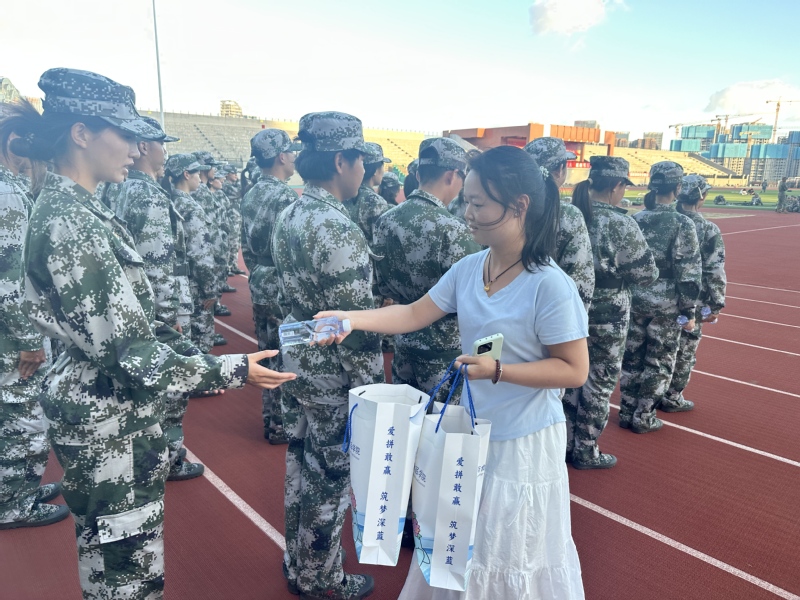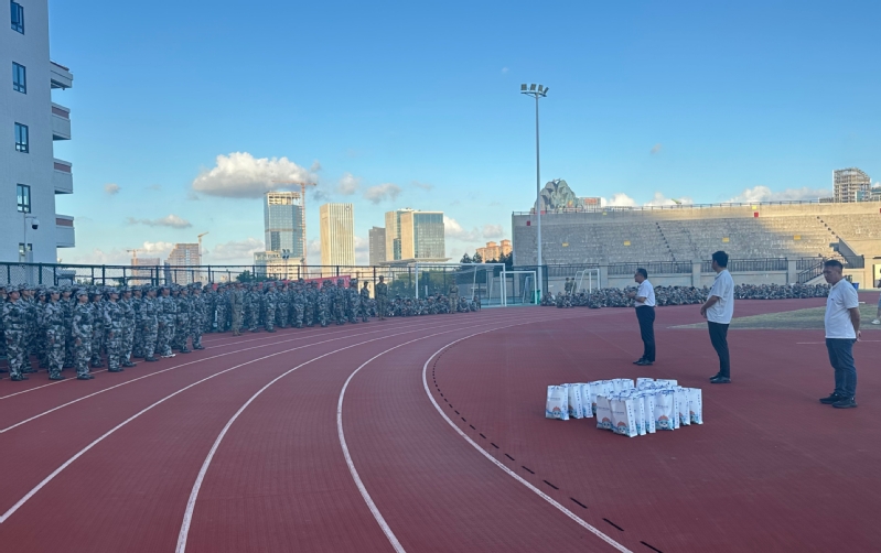 慰问中,蔡志荣一行还为军训教官和同学们带来了专属降温礼物——定制款“泉小海”矿泉水。这份满载心意的惊喜,让严肃的训练场瞬间充满欢呼与暖意,清凉的矿泉水不仅驱散了初秋的燥热,更让新生们深切感受到学院的关怀。