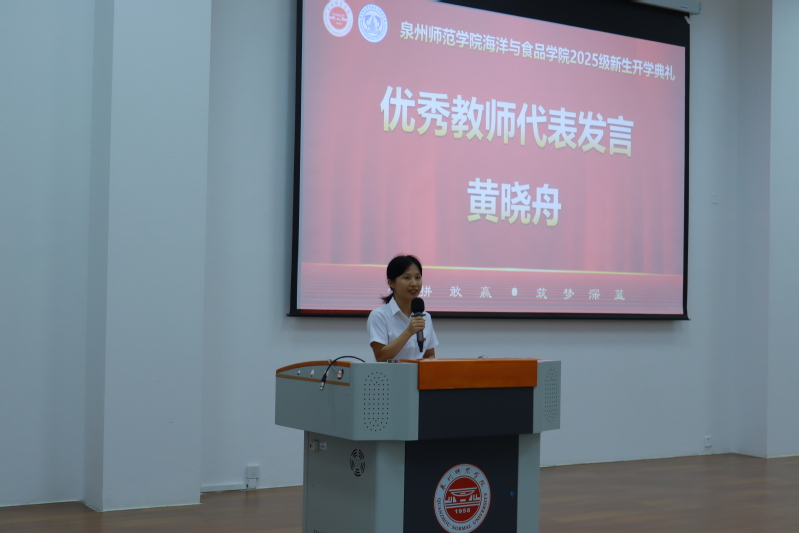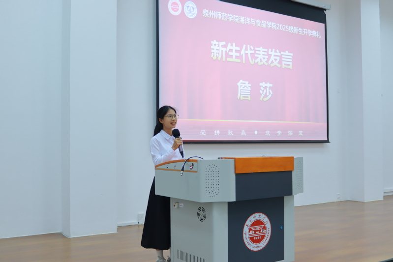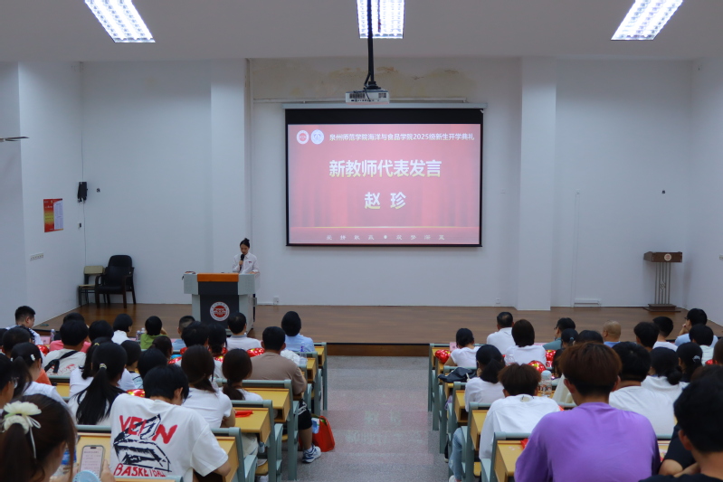 新教师代表赵珍博士结合中科院海洋所的科研经历,表达了对学院科研平台的期待。她表示,将推动对虾高效养殖研究与食品产业深度融合,教学中注重“理论与实践相统一”,并寄语新生“海丝起点的包容与创新,将滋养我们共同成长”。