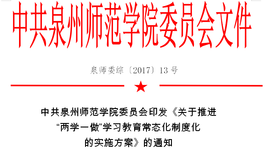 根据《中共中央办公厅印发〈关于推进“两学一做”学习教育常态化制度化的意见〉的通知》(中办发〔2017〕23号)、福建省委《关于推进“两学一做”学习教育常态化制度化的实施方案》(闽委办发〔2017〕18号)和省委教育工委《关于推进全省高等学校“两学一做”学习教育常态化制度化的指导意见》(闽委教组〔2017〕15号)精神,结合我校实际,现就推进“两学一做”学习教育常态化制度化提出如下实施方案。