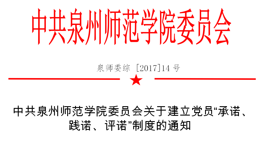 为了推进“两学一做”学习教育常态化制度化工作,充分发挥基层党组织的战斗堡垒作用和党员的先锋模范作用,凝聚学校综合改革与转型发展的力量,提振干事创业的精气神,根据《中共泉州市委组织部关于建立党员“承诺、践诺、评诺”制度的通知》(泉委组综〔2017〕71号),经研究,决定建立党员“承诺、践诺、评诺”制度。有关事项通知如下:
