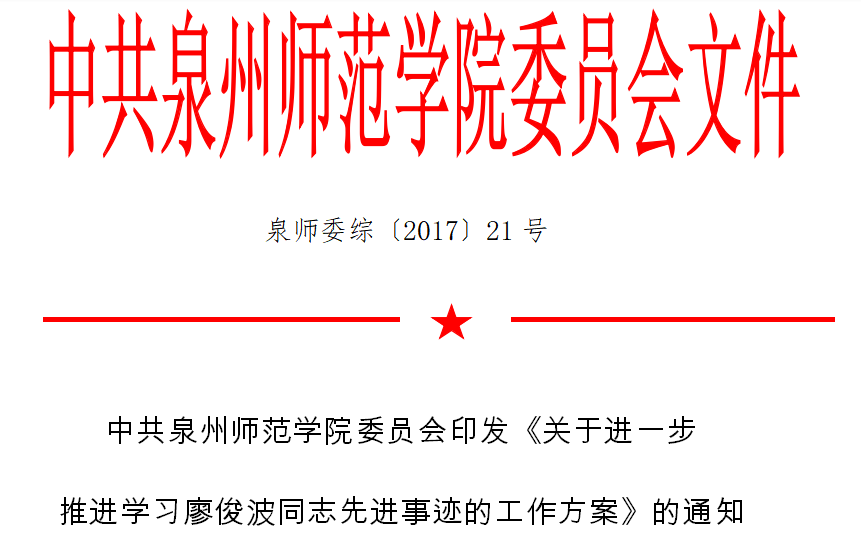 优秀共产党员”称号,并下发《中共中央关于追授廖俊波同志全国优秀共产党员”称号的决定》。为深入贯彻落实习近平总书记重要指示精神、中共中央《决定》和刘云山同志在福建调研时的重要讲话精神, 根据《中共福建省委关于认真贯彻落实中共中央<决定>进一步推进全省学习廖俊波同志先进事迹的通知》要求,现就进一步推进学习廖俊波同志先进事迹,加快学校转型发展,以优异成绩迎接党的十九大胜利召开, 制定如下工作方案: