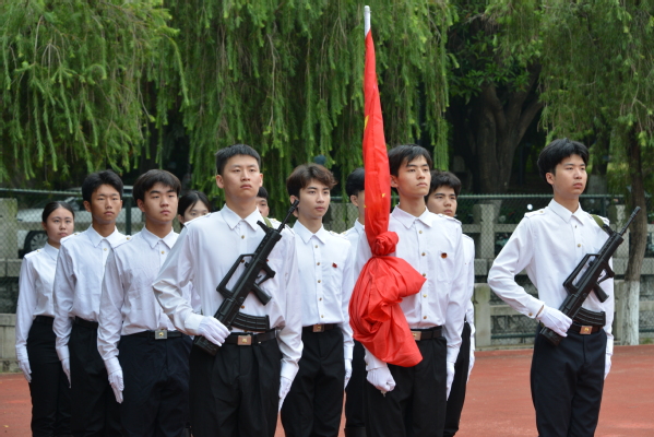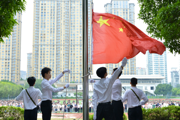 6点50分,升旗仪式正式开始。校国旗仪仗队以铿锵有力的步伐,整齐划一的动作,庄严地护送五星红旗至升旗台。随着旋律激昂的《义勇军进行曲》响起,五星红旗在晨光中缓缓升起,全体师生庄严肃立,行注目礼,齐唱国歌。
