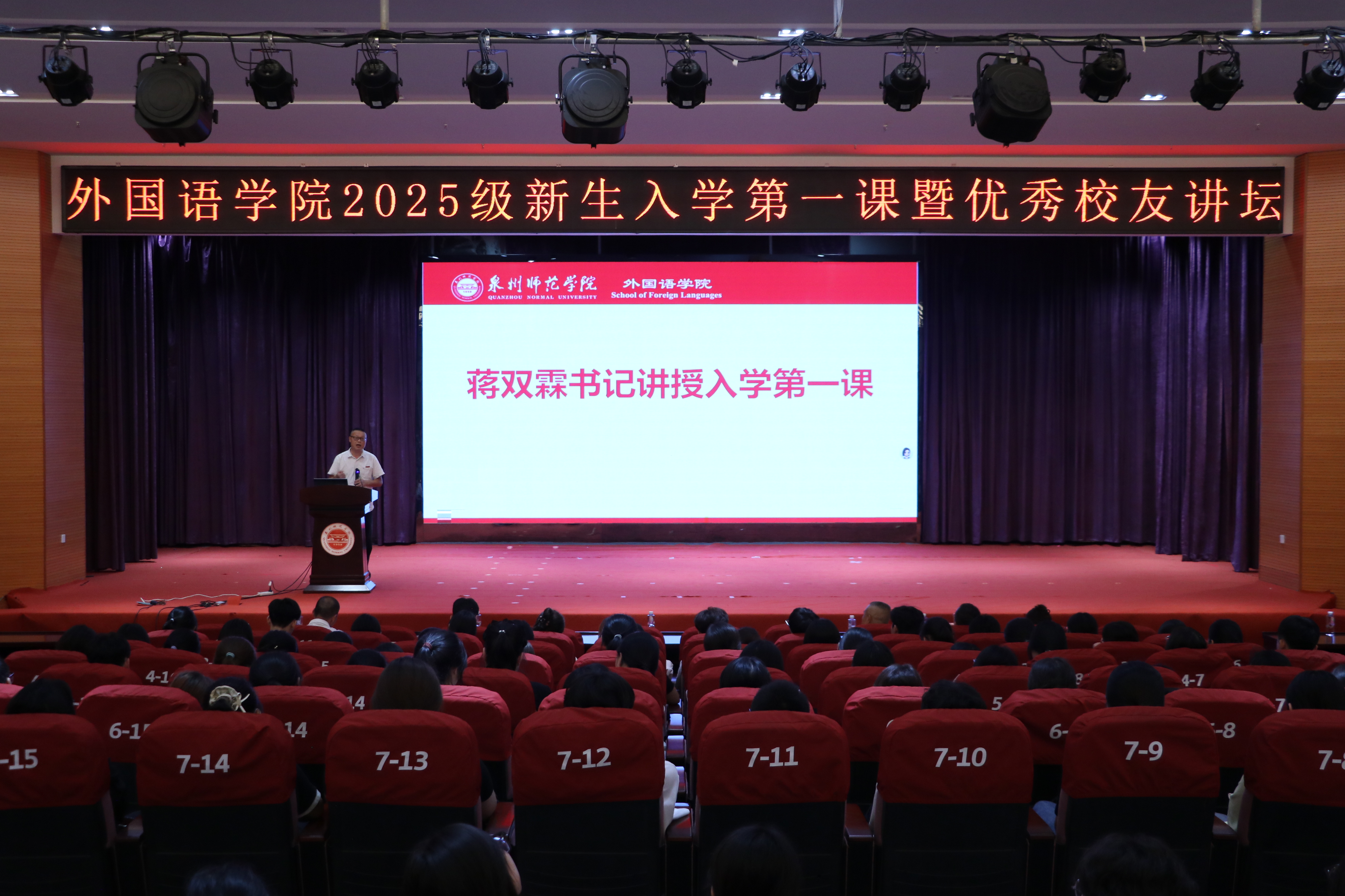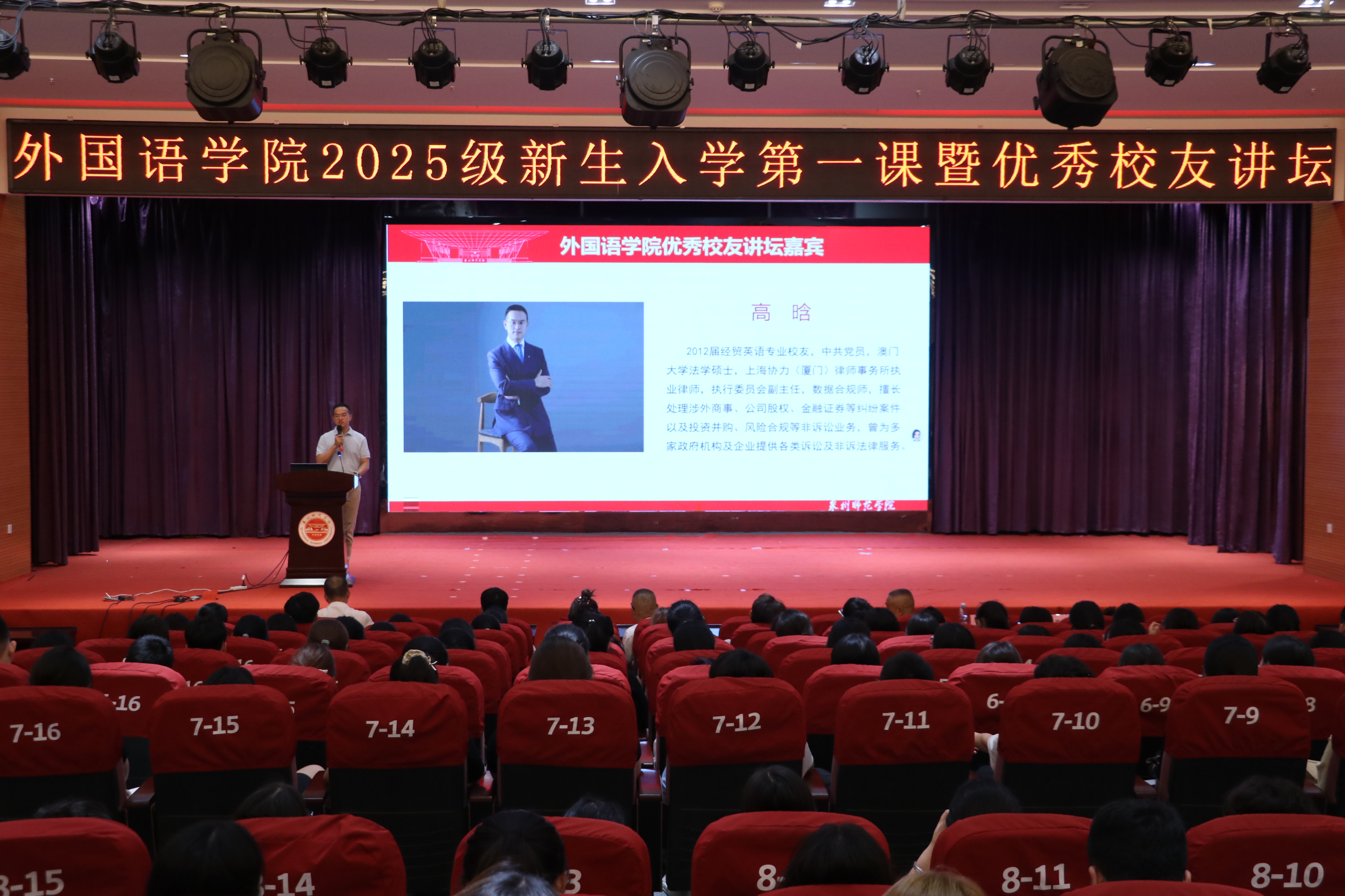 9月13日,外国语学院在特教大楼第一学术报告厅举行2025级新生入学第一课暨优秀校友讲坛。学院党政负责人、教师代表、优秀校友及全体新生参加。