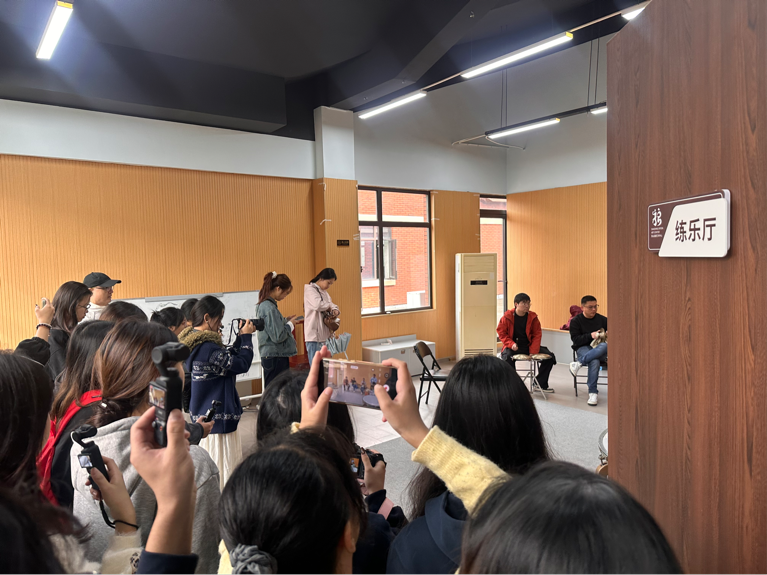 在萧山绍剧艺术中心,开启以“探寻绍剧魅力,记录非遗华彩”为主题的艺术研学。在中心副团长楼炬的带领下,同学们聆听了一场震撼的锣鼓演奏《龙虎斗》,领略“锣鼓半台戏”的艺术张力。青年演员们展示了扎实的基本功与精彩的武戏选段,从《硃砂球》到《虹桥赠珠》,锤花翻飞、枪影闪烁,引得掌声不断。