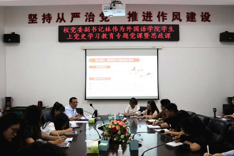6月22日下午三时许,校党委副书记林伟在外文楼党员活动室为外国语学院学生干部上党史学习教育专题党课暨思政课。此次活动由外国语学院团委书记陈奕希老师主持。外国语学院辅导员老师张建宇、陈杰松,院两委会、自律会学生干部参加。