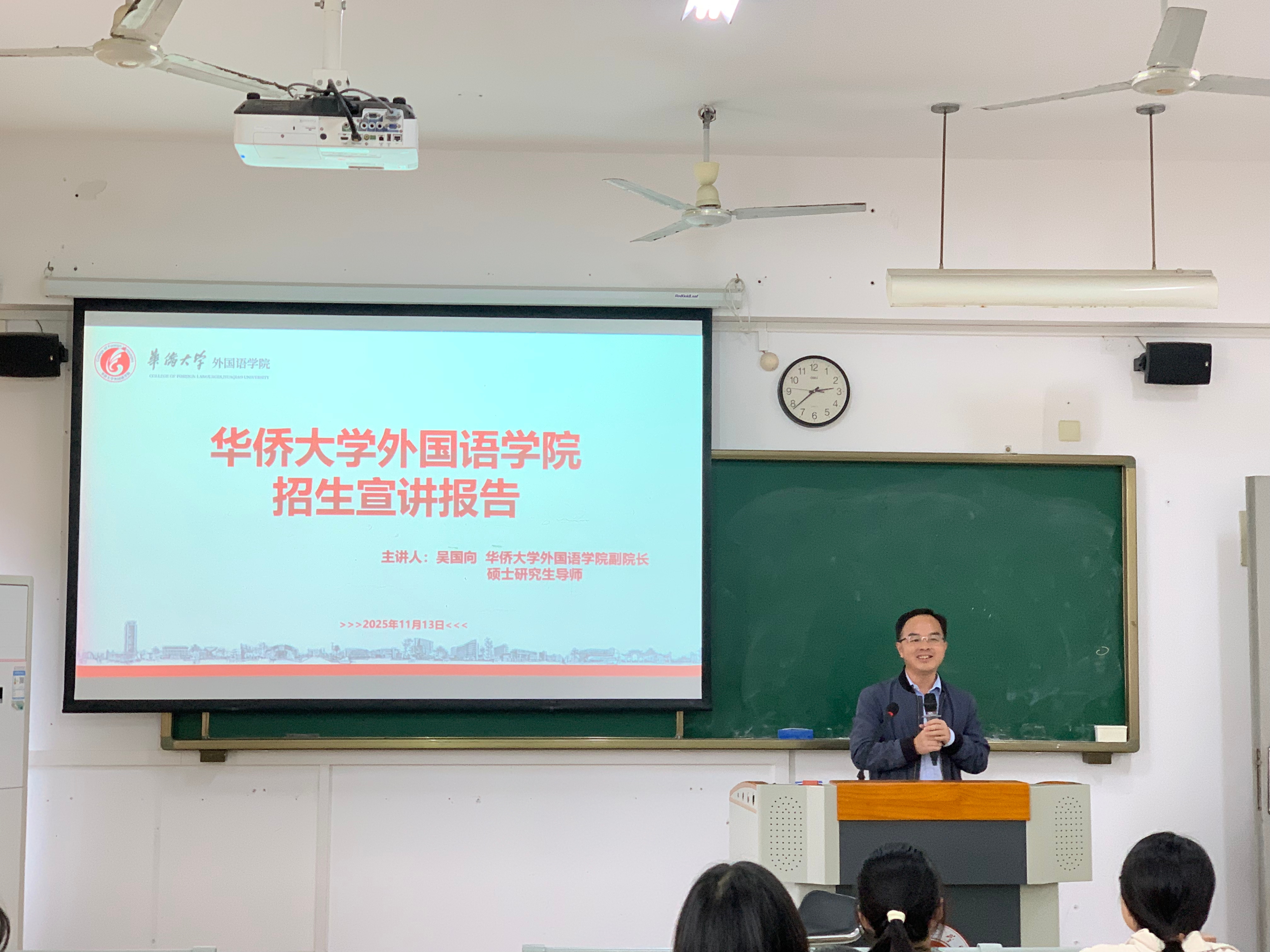 首先,吴国向介绍了华侨大学外国语学院的办学特色、博士硕士学位授予情况,以及研究生招生专业、研究方向、导师团队等情况。他还介绍了外国语言文学、翻译硕士近年考研专业课考查重点,强调择校需兼顾院校特色与自身实力。