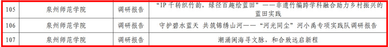 近日,中共福建省委教育工作委员会公布了“追寻领袖足迹 担当强国使命”2025年全省大学生暑期社会实践活动评选结果,我院《守护碧水蓝天共筑锦绣山河——“河光同尘”河小禹专项实践队调研报告》荣获优秀实践成果。